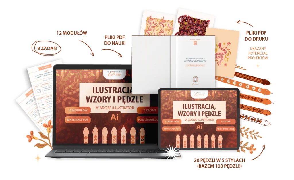 To nie jest kolejny tutorial o samych narzędziach Illustratora ponieważ jest to esencja moich 10 lat doświadczenia, setek projektów i wielu godzin spędzonych na rozwiązywaniu typowych i tych mniej oczywistych problemów z pracą w wektorach. Właśnie dlatego stworzyłam ten kurs, żeby od razu pokazać Ci dobre praktyki, skróty i ustawienia, które pozwolą Ci rysować szybko, lekko i świadomie.