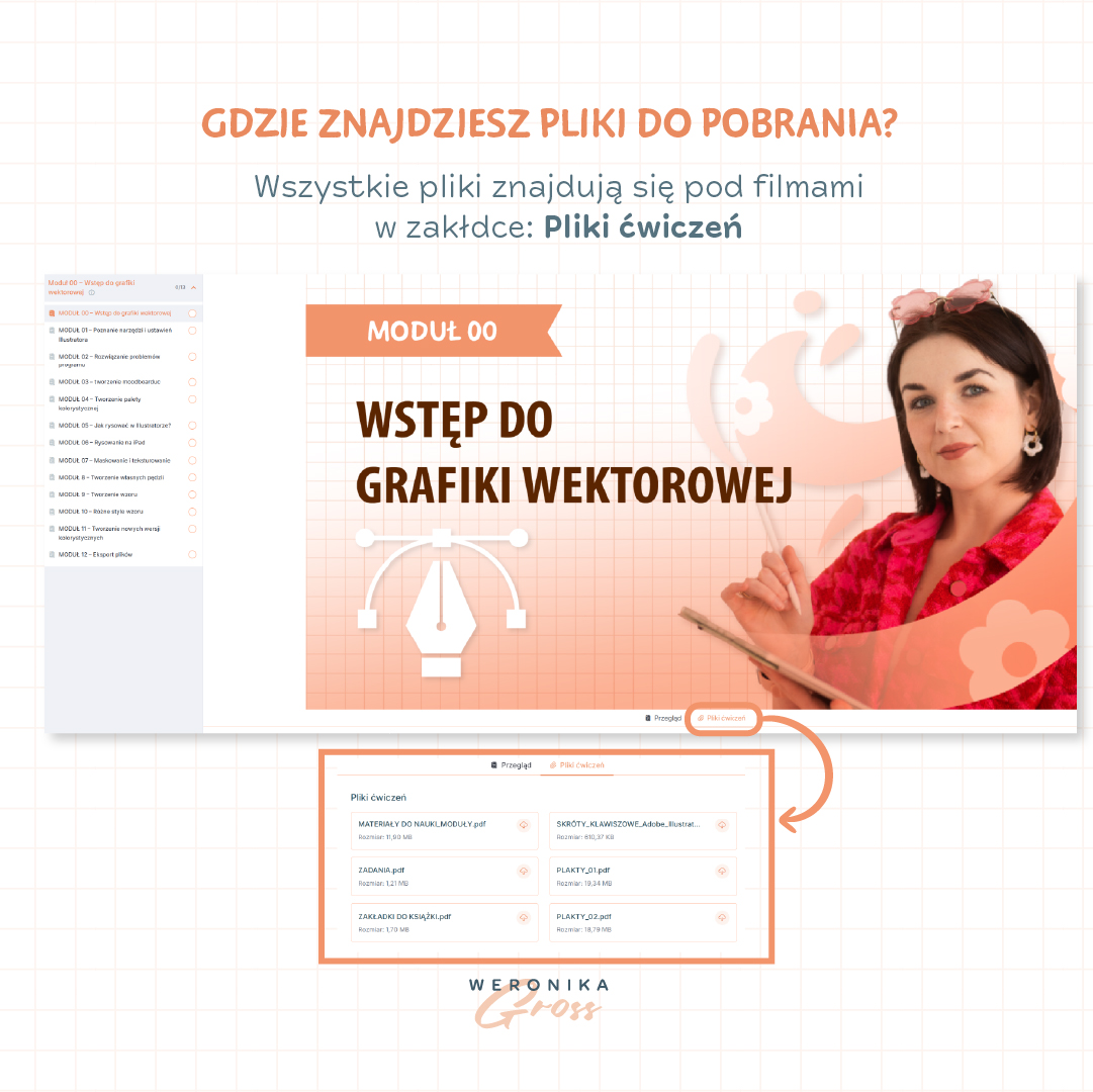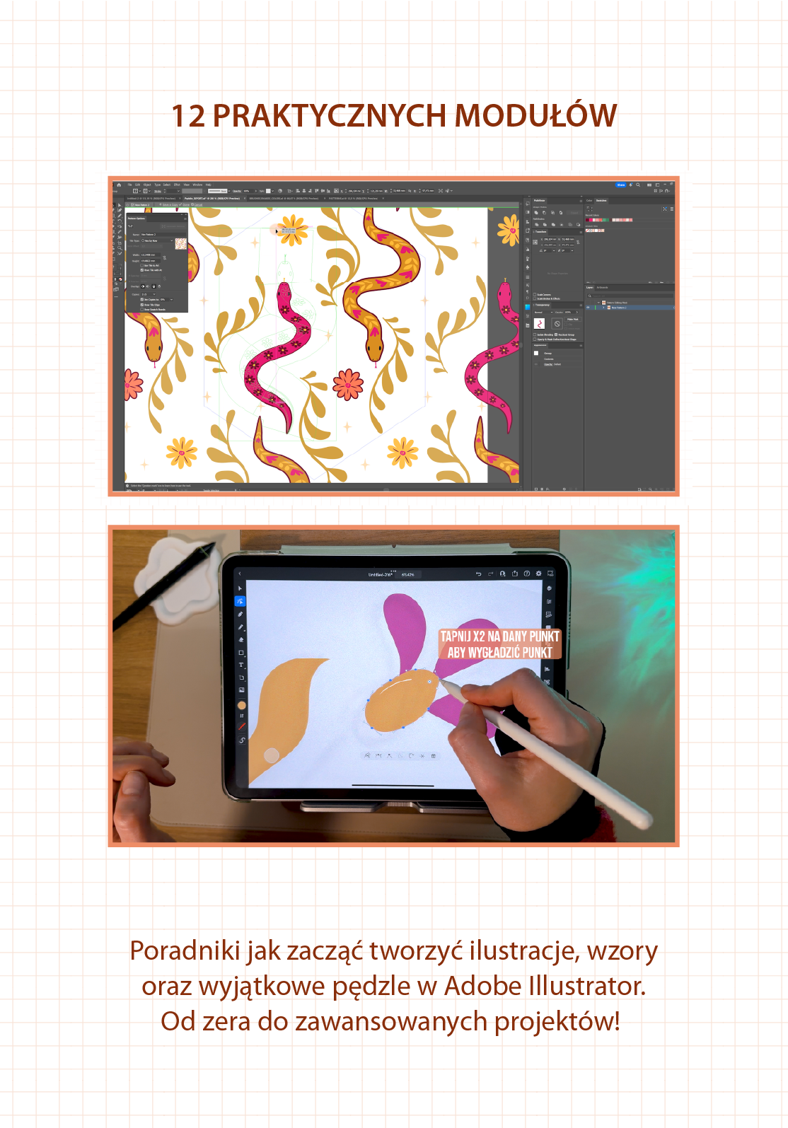 Kurs składa się z 12 praktycznych modułów, które krok po kroku przeprowadzą Cię przez cały proces tworzenia ilustracji i wzorów wektorowych – od pierwszej kreski aż po poprawnie przygotowany plik do eksportu.